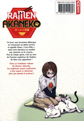 Un restaurant de ramens, des patrons chats, une humaine happiness manager... Le nouveau manga feel-good qui fait ronronner le Japon ! Un jour, une inconnue débarque au restaurant en plein service et appelle Hana " Love Bibi ", mais cette dernière ne semble pas rassurée en la voyant... . Peu de temps après, c'est au tour de l'ancien supérieur de Yashiro de faire son apparition ! Dans ce troisième volume de Ramen Akaneko, les employés seront confrontés à leur passé et chériront plus que jamais le présent !