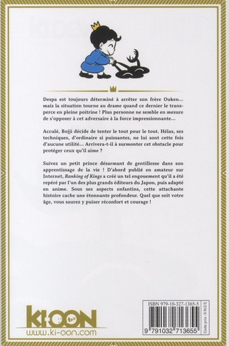 Le parcours riche en émotions et en aventures d'un petit prince sourd-muet à la conquête du monde ! Despa est toujours déterminé à arrêter son frère Ouken... mais la situation tourne au drame quand ce dernier le transperce en pleine poitrine ! Plus personne ne semble en mesure de s'opposer à cet adversaire à la force impressionnante... Acculé, Bojji décide de tenter le tout pour le tout. Hélas, ses techniques, d'ordinaire si puissantes, ne lui sont cette fois d'aucune utilité, et la peur s'empare du garçonnet... Arrivera-t-il à la surmonter pour protéger ceux qu'il aime ? Suivez un petit prince désarmant de gentillesse dans son apprentissage de la vie ! D'abord publié en amateur sur Internet, Ranking of Kings a créé un tel engouement qu'il a été repéré par l'un des plus grands éditeurs du Japon, puis adapté en anime . Sous ses aspects enfantins, cette attachante histoire cache une étonnante profondeur. Quel que soit votre âge, vous saurez y puiser réconfort et courage !