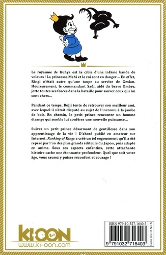Le royaume de Kuhya est la cible d'une infâme bande de voleurs ! La princesse Mehi et le roi sont en danger... En effet, Ringi n'était autre qu'une taupe au service de Geslan. Heureusement, le commandant Sadi, aidé du brave Ombre, jette toutes ses forces dans la bataille pour sauver ceux qui lui sont chers... Pendant ce temps, Bojji tente de retrouver son meilleur ami, avec lequel il s'était disputé au sujet de l'inconnu a la jambe de bois. En chemin, le petit prince rencontre un homme étrange qui semble lui conférer une nouvelle puissance... Suivez un petit prince désarmant de gentillesse dans son apprentissage de la vie ! D'abord publié en amateur sur Internet, Ranking of Kings a créé un tel engouement qu'il a été repéré par l'un des plus grands éditeurs du Japon, puis adapté en anime. Sous ses aspects enfantins, cette attachante histoire cache une étonnante profondeur. Quel que soit votre âge, vous saurez y puiser réconfort et courage !
