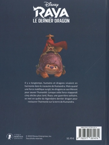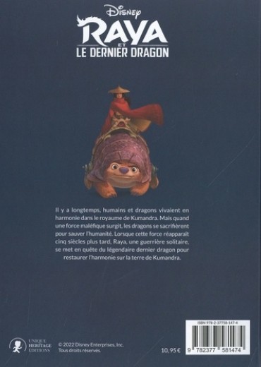 Retrouvez l'histoire du film Disney Raya et le Dernier Dragon dans une magnifique bande dessinée ! Ce livre de 56 pages comprend une présentation des personnages, une carte de Kumandra, des citations du film et l'histoire complète au format BD. A lire dès 7 ans. Il y a longtemps, humains et dragons vivaient en harmonie dans le royaume de Kumandra. Mais quand une force maléfique surgit, les dragons se sacrifièrent pour sauver l'humanité. Lorsque cette force réapparaît cinq siècles plus tard, Raya, une guerrière solitaire, se met en quête du légendaire dernier dragon pour restaurer l'harmonie sur la terre de Kumandra, au sein d'un peuple désormais divisé.