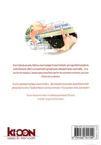 Avec l'aide de ses amis, Satoru a réussi à piéger le tueur d'enfants, qui s'apprêtait à prendre la petite Kumi pour cible ! La vie peut enfin reprendre pour celui que le temps avait oublié... et sa carrière de mangaka s'annonce plus prometteuse que lors de sa première existence, peu à peu effacée de sa mémoire. Il reste cependant quelques zones d'ombre... Que faisaient ses proches quand Satoru était plongé dans le coma ? Quelle influence son long sommeil a-t-il eu sur leurs choix, leur destin ? Vous le découvrirez dans cet épilogue passionnant d'Erased, le thriller temporel de Kei Sanbe !