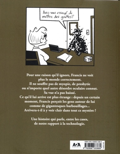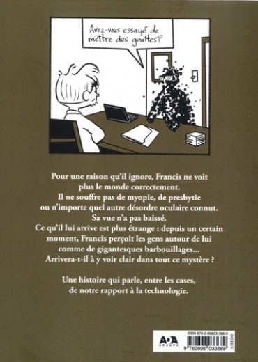 Pour une raison qu'il ignore, Francis ne voit plus le monde correctement. Il ne souffre pas de myopie, de presbytie ou n'importe quel autre désordre oculaire connut. Sa vue n'a pas baissé. Ce qu'il lui arrive est plus étrange : depuis un certain moment, Francis perçoit les gens autour de lui comme de gigantesques barbouillages... Arrivera-t-il à y voir clair dans tout ce mystère ? Une histoire qui parle, entre les cases, de notre rapport à la technologie.