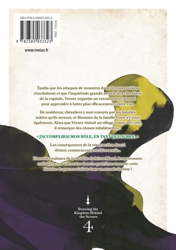 Tandis que les attaques de monstres dans des pays voisins s'enchaînent et que l'inquiétude grandit au sein des chevaliers de la capitale, Verner organise un entraînement groupé pour apprendre à lutter plus efficacement contre eux. De nombreux chevaliers y sont envoyés par les familles nobles qu'ils servent, et Hermine de la famille Furst s'y joint également. Alors que Verner visitait un village voisin avec elle, il remarque des choses inhabituelles... Les conséquences de la résurrection du roi démon commencent à se faire sentir... Dans les coulisses de la bataille du héros Mazel, les personnes ordinaires travaillent dur dans le quatrième tome de cette histoire de guerre réaliste dans un monde fantasy !