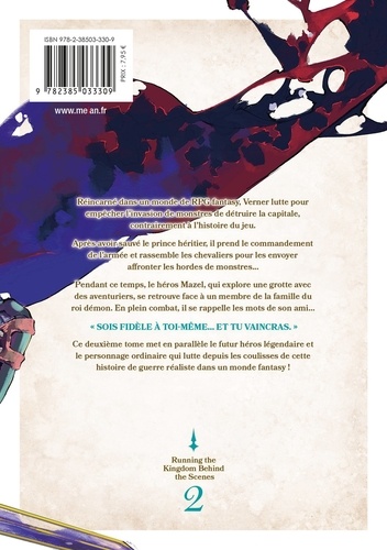 Je me battrai aux côtés de mon ami... en tant que héros. Les chroniques de guerre d'un héros ordinaire au coeur d'un récit légendaire ! Réincarné dans un monde de RPG fantasy, Verner se démène pour empêcher l'invasion de monstres de détruire la capitale, contrairement au scénario prévu dans le jeu. Après avoir sauvé le prince héritier, il prend le commandement de l'armée et rassemble les chevaliers aguerris pour les envoyer affronter les hordes de monstres... Pendant ce temps, le héros Mazel, qui explore une grotte avec des aventuriers, se retrouve face à un membre de la famille du roi démon. En plein combat, il se rappelle les mots de son ami... " Sois fidèle à toi-même... et tu vaincras. "