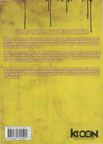 Grâce au sacrifice de ses amis, Asuka réussit à mettre en place le tout dernier morceau de corps. Mais lorsque Haruka lui demande d'entrer dans le cercueil, elle commence à avoir des doutes... et à juste titre : la voilà obligée de participer à la chasse au corps, cette fois-ci dans le rôle de la victime ! Pour l'adolescente, le cauchemar est loin d'être terminé. A part Takahiro, tout le monde l'a oubliée, et elle ne peut plus quitter l'enceinte du lycée ! Une nouvelle partie commence alors... Mêmes règles, nouveaux joueurs : ces derniers parviendront-ils à triompher de la Rouge-Sang ? Série de romans horrifiques à l'ambiance poisseuse et oppressante, Re/member a connu un succès foudroyant au Japon depuis le début de sa publication en 2013. Son adaptation en manga est actuellement la série la plus populaire du Jump+ de Shueisha !