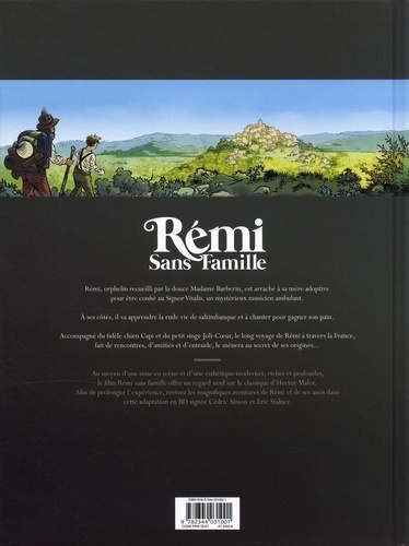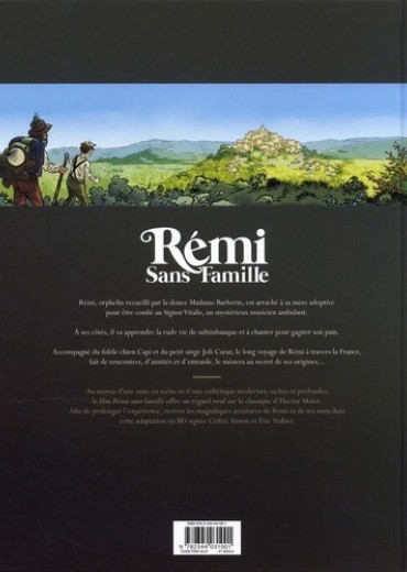 Rémi, orphelin recueilli par la douce Madame Barberin, est arraché à sa mère adoptive pour être confié au Signor Vitalis, un mystérieux musicien ambulant. A ses côtés, il va apprendre la rude vie de saltimbanque et à chanter pour gagner son pain. Accompagné du fidèle chien Capi et du petit singe Joli-Coeur, le long voyage de Rémi à travers la France, fait de rencontres, d'amitiés et d'entraide, le mènera au secret de ses origines... Au moyen d'une mise en scène et d'une esthétique modernes, riches et profondes, le film Rémi sans famille offre un regard neuf sur le classique d'Hector Malot. Afin de prolonger l'expérience, revivez les magnifiques aventures de Rémi et de ses amis dans cette adaptation en BD signée Cédric Simon et Eric Stalner.