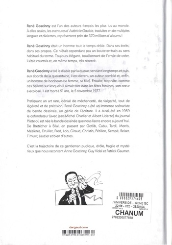 René Goscinny est l'un des auteurs français les plus lus au monde. A elles seules, les aventures d'Astérix le Gaulois, traduites en de multiples langues et dialectes, représentent près de 370 millions d'albums ! René Goscinny était un homme tout le temps drôle. Dans ses écrits, dans ses propos. Ce n'était cependant pas un boute-en-train au sens habituel du terme. Toujours élégant, bouillonnant de l'envie de créer, il était courtois et, en même temps, très réservé. René Goscinny a tiré le diable par la queue pendant longtemps et puis, aux abords de la quarantaine, il est devenu un auteur comblé et, enfin, un homme de bonheurs (sa femme, sa fille). Ensuite, trop vite, comme ces ballons sur lesquels il aimait tirer dans les fêtes foraines, son coeur a explosé. Il est mort à 51 ans, le 5 novembre 1977. Pratiquant un art rare, dénué de méchanceté, de vulgarité, tout de légèreté et de précision, René Goscinny a été un immense scénariste de bande dessinée, un génie de l'écriture. Il a aussi été en 1959 le cofondateur (avec Jean-Michel Charlier et Albert Uderzo) du journal Pilote où est née la bande dessinée que nous lisons encore aujourd'hui. De Bretécher à Bilal, en passant par Gotlib, Cabu, Tardi, Morris, Mézières, Druillet, Fred, Lob, Giraud, Christin, Pétillon, Sempé, Reiser, F'murrr, Lauzier et bien d'autres. C'est la trajectoire de ce gentleman pudique, drôle, fragile et mystérieux que nous racontent Anne Goscinny, Guy Vidal et Patrick Gaumer.