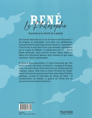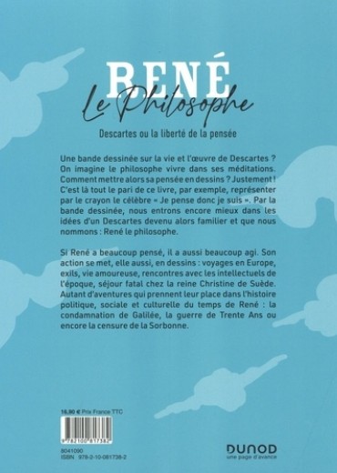 Cet ouvrage s'adresse à tous ceux qui aiment la philosophie et à tous les néophytes qui souhaiteraient aller plus loin dans la découverte de l'oeuvre de Descartes. Nous avons choisi la forme de la bande dessinée propre à la vulgarisation de la pensée du grand philosophe. Les auteurs mettent en perspective ses grandes idées, ses ouvrages majeurs, sa biographie et le contexte historique. Le lecteur voit se dérouler la vie du philosophe et comprend les éléments majeurs de sa philosophie qui en découle. La vie de Descartes se prête particulièrement bien à cette forme d'ouvrage : sa vie est faite d'aventures et d'action (participation à des guerres, voyages en Europe, exils, accueil par la reine Christine de Suède, Elizabeth de Bohème, nombreux contacts avec les intellectuels, nombreuses lettres à des personnalités connues). Ces aventures sont souvent en lien avec l'histoire politique, sociale et culturelle de son temps (condamnation de Galilée, guerre de Trente Ans, censure de la Sorbonne, etc.). L'oeuvre philosophique de Descartes se développe dans ce contexte avec ses idées clés : "Je pense donc je suis" (Discours de la méthode) ; le corps machine (Traité de l'homme), et autres. On met aussi l'accent sur son travail scientifique (loi de la réfraction, repères cartésiens, étude du cerveau)...