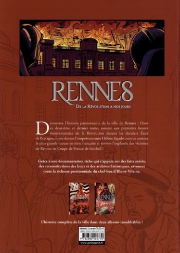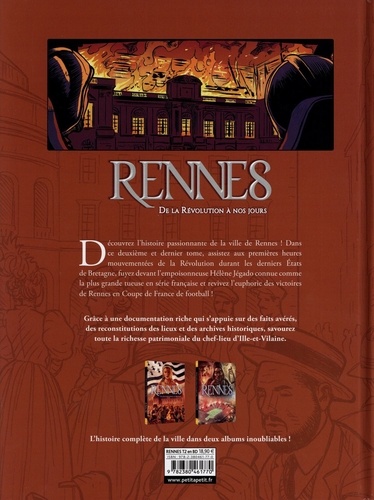 Découvrez la ville de Rennes avec un Docu-BD passionnant ! Dans ce deuxième et dernier tome, assistez aux turbulences de la Révolution, revivez la terreur qu'inspirait la première tueuse en série de l'Histoire, Hélène Jegado, ou bien l'euphorie des victoires de Rennes en coupe de France de football ! Grâce à une documentation riche qui s'appuie sur des faits avérés, des reconstitutions des lieux et des archives historiques, savourez toute la richesse patrimoniale du chef-lieu d'Ille-et-Vilaine.