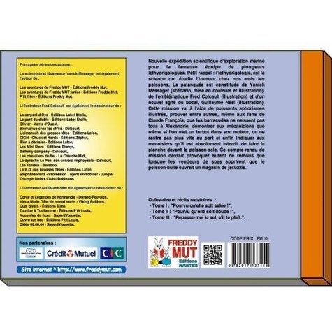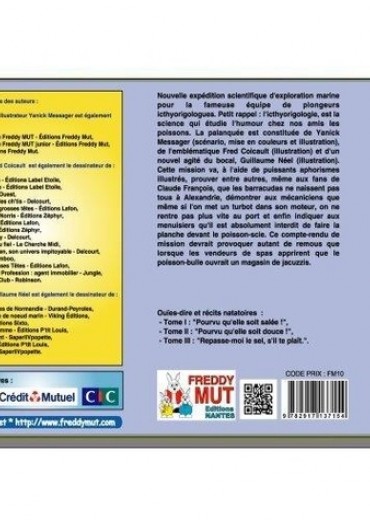 Nouvelle expédition scientifique d'exploration marine pour la fameuse équipe de plongeurs icthyorigologues. Petit rappel : l'icthyorigologie, est la science qui étudie l'humour chez nos amis les poissons. La palanquée est constituée de Yanick Messager (scénario, mise en couleurs et illustration), de l'emblématique Fred Coicault (illustration) et d'un nouvel agité du bocal, Guillaume Néel (illustration). Cette mission va, à l'aide de puissants aphorismes illustrés, prouver entre autres, même aux fans de Claude François, que les barracudas ne naissent pas tous à Alexandrie, démontrer aux mécaniciens que même si l'on met un turbot dans son moteur, on ne rentre pas plus vite au port et enfin indiquer aux menuisiers qu'il est absolument interdit de faire la planche devant le poisson-scie. Ce compte-rendu de mission devrait provoquer autant de remous que lorsque les vendeurs de spas apprirent que le poisson-bulle ouvrait un magasin de jacuzzis.