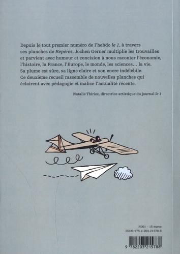 Depuis le tout premier numéro de l'hebdo le 1, à travers ses planches de Repères, Jochen Gerner multiplie les trouvailles et parvient avec humour et concision à nous raconter l'économie, l'histoire, la France, l'Europe, le monde, les sciences... la vie. Sa plume est sûre, sa ligne claire et son encre indélébile. Ce deuxième recueil rassemble de nouvelles planches qui éclairent avec pédagogie et malice l'actualité récente.