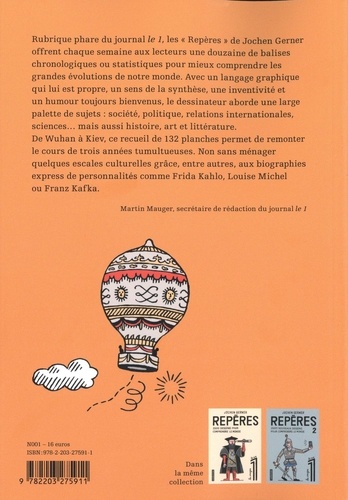 S'extraire du flot de l'actualité pour redonner à l'information sa densité, s'attacher aux courants profonds plutôt qu'aux remous de surface : c'est l'objectif que s'est fixé Le 1 à sa création en 2014. Rubrique phare du journal, les Repères de Jochen Gerner offrent chaque semaine aux lecteurs une douzaine de balises chronologiques ou statistiques pour mieux comprendre les grandes évolutions de notre monde. Avec un langage graphique qui lui est propre, un sens de la synthèse, une inventivité et un humour toujours bienvenus, le dessinateur aborde une large palette de sujets : société, politique, relations internationales, sciences... mais aussi histoire, art et littérature. De Wuhan à Kiev, ce recueil de 128 planches permet de remonter le cours de trois années tumultueuses. Non sans ménager quelques escales culturelles grâce, entre autres, aux biographies express de personnalités comme Frida Kahlo, Louise Michel ou Franz Kafka.