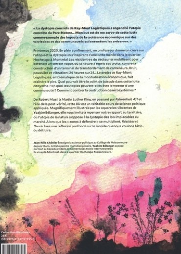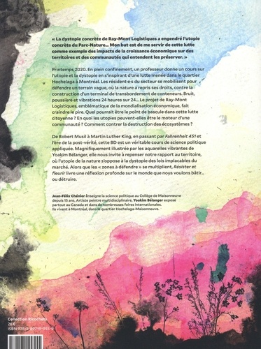 "La dystopie concrète de Ray-Mont Logistiques a engendré l'utopie concrète du Parc-Nature... Mon but est de me servir de cette lutte comme exemple des impacts de la croissance économique sur des territoires et des communautés qui entendent les préserver. " Printemps 2020. En plein confinement, un professeur donne un cours sur l'utopie et la dystopie en s'inspirant d'une lutte menée dans le quartier Hochelaga à.Montréal. Les résident.e.s du secteur se mobilisent pour défendre un terrain vague, où la nature a repris ses droits, contre la construction d'un terminal de transbordement de conteneurs. Bruit, poussière et vibrations 24 heures sur 24... Le projet de Ray-Mont Logistiques, emblématique de la mondialisation économique, fait craindre le pire. Quel pourrait être le point de bascule dans cette lutte citoyenne ? En quoi les utopies peuvent-elles être le moteur d'une communauté? Comment contrer la destruction des écosystèmes ? De Robert Musil à Martin Luther King, en passant par Fahrenheit 451 et l'ère de la post-vérité, cette BD est un véritable cours de science politique appliquée. Magnifiquement illustrée par les aquarelles vibrantes de Yoakim Bélanger, elle nous invite à repenser notre rapport au territoire, où l'utopie de la nature s'oppose à la dystopie des lois implacables du marciié. Alors que les "zones à défendre" se multiplient, Résister et fleurir livre une réflexion profonde sur le monde que nous voulons bâtir... ou détruire.