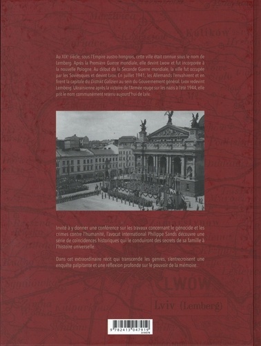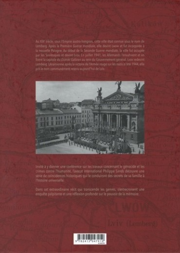 C'est à Lemberg que le grand-père de Philippe Sands passe son enfance avant d'échapper à l'Holocauste qui décima sa famille. C'est là que deux juristes juifs, Lauterpacht et Lemkin, étudient le droit et jouent un rôle déterminant au procès de Nuremberg. C'est là que Hans Frank, haut dignitaire nazi, annonce, en 1942, la mise en place de la "Solution finale" qui condamna des millions de Juifs.