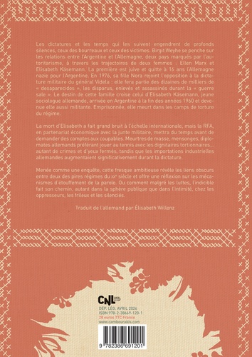 Les dictatures et les temps qui les suivent engendrent de profonds silences, ceux des bourreaux et ceux des victimes. Birgit Weyhe se penche sur les relations entre l'Argentine et l'Allemagne, deux pays marqués par l'autoritarisme, à travers les trajectoires de deux femmes : Ellen Marx et Elisabeth Käsemann. La première est juive et quitte à 16 ans l'Allemagne nazie pour l'Argentine. En 1976, sa fille Nora rejoint l'opposition à la dictature militaire du général Videla : elle fera partie des dizaines de milliers de " desaparecidos ", les disparus, enlevés et assassinés durant la " guerre sale ". Le destin de cette famille croise celui "Elisabeth Käsemann, jeune sociologue allemande, arrivée en Argentine à la fin des années 1960 et devenue elle aussi militante. Emprisonnée, elle meurt dans tes camps de torture du régime. La mort "Elisabeth a fait grand bruit à l'échelle internationale, mais la RFA, en partenariat économique avec la junte militaire, mettra du temps avant de demander des comptes aux coupables. Meurtres de masse, mensonges, diplomates allemands préférant jouer au tennis avec les dignitaires tortionnaires... autant de crimes et d'yeux fermés, tandis que les importations industrielles allemandes augmentaient significativement durant la dictature. Menée comme une enquête, cette fresque ambitieuse révèle les liens obscurs entre deux des pires régimes du XXe siècle et offre une réflexion sur les mécanismes d'étouffement de la parole. Ou comment malgré les luttes, [indicible fait son chemin, autant dans la sphère publique que dans [intimité, chez les oppresseurs, les frileux et les silenciés.