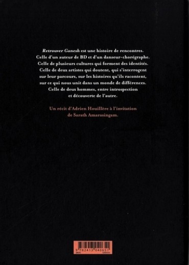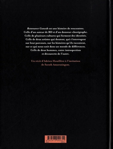 Un jour, Vimal, le chorégraphe, a invité Adrien, le dessinateur, à suivre la création de son spectacle. Mais plus que la danse, Adrien s'est mis à raconter ce qui fait les artistes... Retrouver Ganesh est une histoire de rencontres. Celle d'Adrien, auteur de BD, et de Vimal Amarasingam, chorégraphe. Celle de plusieurs cultures qui forment des identités. Celle de deux artistes qui doutent, de deux hommes qui s'interrogent sur leur parcours, sur les histoires qu'ils racontent, sur ce qui nous unit dans un monde de différences. Rarement la danse n'aura été aussi bien dessinée.