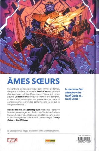 On connaît bien Frank Castle, le Punisher, devenu tueur en série de criminels suite à l'assassinat de sa famille. On connaît un peu moins bien le Frank Castle d'un futur apocalyptique, mort puis ressuscité par Méphisto en tant que Ghost Rider, devenu héraut de Galactus puis bras droit de Thanos. Ce Ghost Rider cosmique est revenu dans le passé, s'est allié aux Gardiens de la Galaxie puis aux Avengers, avant de reprendre sa course effrénée dans l'espace sidéral. Voici ses nouvelles aventures, aux côtés de Cammi, découverte dans la série Avengers Arena. Cette nouvelle mini-série consacre une des révélations de ces dernières années, le personnage du Ghost Rider cosmique imaginé par Donny Cates dans la série Thanos. Le créateur du personnage revient d'ailleurs avec le dessinateur Geoff Shaw, son partenaire de Thanos, pour une histoire courte de dix pages où le Ghost Rider cosmique affronte enfin le Frank Castle de notre époque ! Le reste de l'album se déroule dans l'espace, sous la houlette de Dennis "Hopeless" Hallum (Avengers Arena, All-New X-Men).
