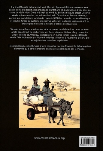 Il y a 5000 ans le Sahara était vert. Demain il pourrait l'être à nouveau. Aux quatre coins du désert, des projets de plantations et d'adduction d'eau sont en cours de réalisation. Dans le Sahel, au nord du Burkina Faso, le projet Deserto Verde, mis en marche par le forestier Lindo Grandi et sa femme Verena, a permis aux populations locales de reverdir 3500 hectares de terrain désertique et inculte. Grâce au système de charrue Vallerani, les terres labourées ont vu croître pas moins de 5 millions d'arbres en douze ans. Tôborè, jeune femme volontaire et attachante, rend visite à sa tante et à son oncle dans le but de rechercher son frère, disparu. Là-bas, elle y rencontre Lindo, Verena et Amadou, et découvre en même temps le projet Deserto Verde. Très intéressée par l'idée d'aider les villageois à reverdir le désert, elle les rejoint alors dans leur expédition. Très didactique, cette BD vise à faire connaître l'action Reverdir le Sahara qui ne demande qu'à être reproduite en d'autres endroits de par le monde.