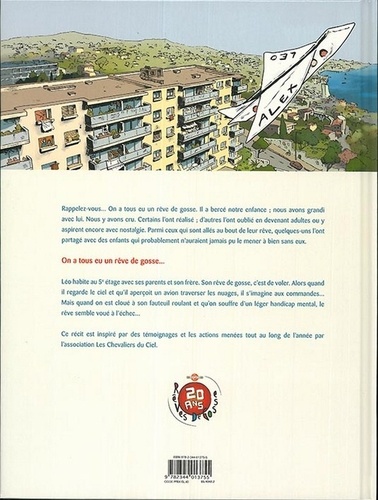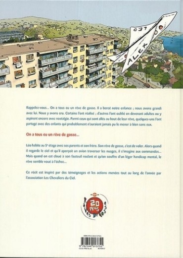 Rappelez-vous... On a tous eu un rêve de gosse. Il a bercé notre enfance ; nous avons grandi avec lui. Nous y avons cru. Certains l'ont réalisé ; d'autres l'ont oublié en devenant adultes ou y aspirent encore avec nostalgie. Parmi ceux qui sont allés au bout de leur rêve, quelques-uns l'ont partagé avec des enfants qui probablement n'auraient jamais pu le mener à bien sans eux. On a tous eu un rêve de gosse... Léo habite au 5e étage avec ses parents et son frère. Son rêve de gosse, c'est de voler. Alors quand il regarde le ciel et qu'il aperçoit un avion traverser les nuages, il s'imagine aux commandes... Mais quand on est cloué à son fauteuil roulant et qu'on souffre d'un léger handicap mental, le rêve semble voué à l'échec... Ce récit est inspiré par des témoignages et les actions menées tout au long de l'année par l'association Les Chevaliers du Ciel.