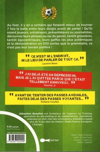 Au foot, il y en a certains qui feraient mieux de tourner 7 fois la balle entre leurs doigts avant de parler ! Qu'ils soient joueurs, entraîneurs, présentateurs ou journalistes, découvrez leurs phrases au ras du gazon, tantôt grossières, tantôt égocentriques, leurs gaffes les plus polémiques et la démonstration en 300 perles que la grammaire, ce n'est pas leur terrain préféré !