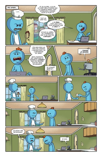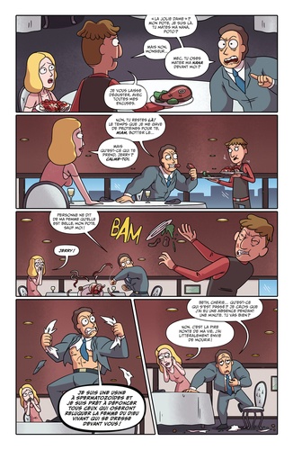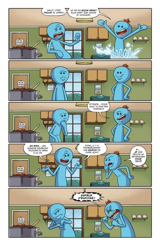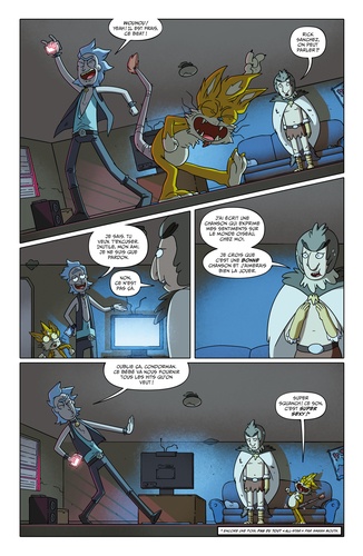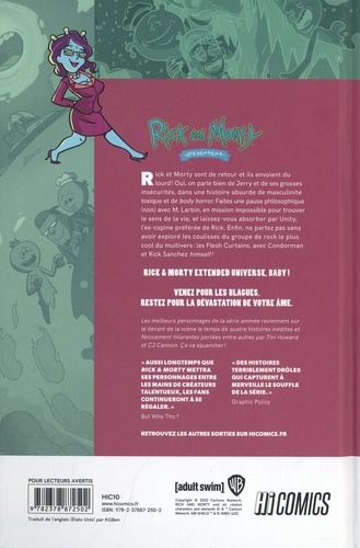 Rick et Morty sont de retour et ils envoient du lourd ! Oui, on parle bien de Jerry et de ses grosses insécurités, dans une histoire absurde de masculinité toxique et de body horror. Faites une pause philosophique (non) avec M. Larbin, en mission impossible pour trouver le sens de la vie, et laissez-vous absorber par Unity, l'ex-copine préférée de Rick. Enfin, ne partez pas sans avoir exploré les coulisses du groupe de rock le plus cool du multivers : les Flesh Curtains, avec Condorman et Rick Sanchez himself ! Les meilleurs personnages de la série animée reviennent sur le devant de la scène le temps de quatre histoires inédites et férocement hilarantes portées entre autres par Tini Howard et CJ Cannon. Ca va squancher ! Rick & Morty extended universe, baby ! Venez pour les blagues, restez pour la dévastation de votre âme. "Aussi longtemps que Rick & Morty mettra ses personnages entre les mains de créateurs talentueux, les fans continueront à se régaler". But Why Tho ? "Des histoires terriblement drôles qui capturent à merveille le souffle de la série". Graphic Policy