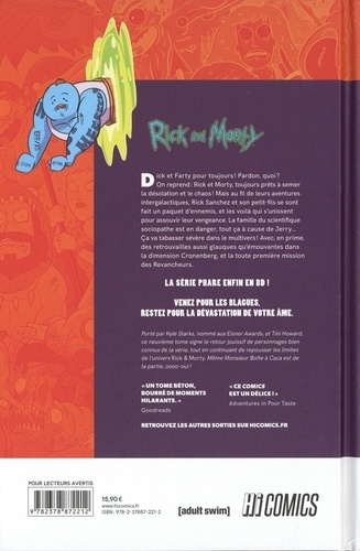 Dick et Farty pour toujours ! Pardon, quoi ? On reprend : Rick et Morty, toujours prêts à semer la désolation et le chaos ! Mais au fil de leurs aventures intergalactiques, Rick Sanchez et son petit-fils se sont faits un paquet d'ennemis, et les voilà qui s'unissent pour réclamer vengeance. La famille du scientifique sociopathe est en danger, tout ça à cause de Jerry... Ca va tabasser sévère dans le multivers ! Avec, en prime, des retrouvailles aussi glauques qu'émouvantes dans la dimension Cronenberg, et la toute première mission des Revancheurs ! La série phare enfin en BD ! Venez pour les blagues, restez pour la dévastation de votre âme. Porté par Kyle Starks, nommé aux Eisner Awards, et Tini Howard, ce neuvième tome signe le retour jouissif de personnages bien connus de la série, tout en continuant de repousser les limites de l'univers Rick & Morty. Il paraît même que Monsieur Boîte à Caca est de la partie, oooo-oui ! " Pour faire une déclaration controversée (en fait, c'est vraiment pas le cas) : le comics Rick & Morty est bien mieux que la série. " Sequential Planet " Ce comics est un délice ! " Adventures in Poor Taste " Un tome béton et bourré de moments hilarants. " Goodreads