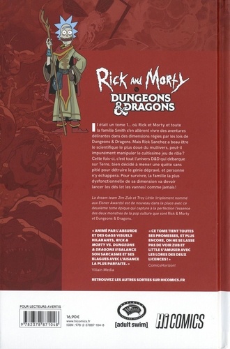 Le combo magique est de retour ! Il était un tome 1... où Rick et Morty et toute la famille Smith s'en allèrent vivre des aventures épiques et délirantes dans des dimensions régies par les lois de Dungeons & Dragons. Mais Rick Sanchez a beau être le scientifique le plus doué du multivers, peut-il impunément manipuler le cultissime jeu de rôles ? Cette fois-ci, c'est tout l'univers D&D qui débarque sur Terre, bien décidé à mener une quête sans pitié pour détruire le génie dépravé, et personne n'y échappera. Pour survivre, la famille la plus dysfonctionnelle de sa dimension va devoir lancer les dés (et les vannes) comme jamais ! La dream team Jim Zub et Troy Little (triplement nommé aux Eisner Awards) est de nouveau dans la place avec ce deuxième tome épique qui capture à la perfection l'essence des deux monstres de la pop culture que sont Rick & Morty et Dungeons & Dragons. "Animé par l'absurde et des gags visuels hilarants, Rick & Morty vs. Dungeons & Dragons balance son sarcasme et ses blagues avec l'aisance la plus parfaite". Villain Media "Ce tome tient toutes ses promesses, et plus encore, on ne se lasse pas de voir Zub et Little s'amuser avec les lores des deux licences ! " ComicsHorizon !