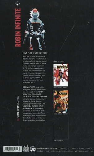 Tome 2 -Le démon intérieur. Alors que victoires éclatantes et défaites mortelles s'enchainent un rythme effréné, le grand tournoi s'apprête à entrer dans sa phase finale. Entretemps, les secrets de l'île de Lazare se dévoilent un à un, laissant apparaître un plan à l'ampleur insoupçonnée... Damian saura-t-il utiliser tout ce qu'il a appris pendant le tournoi, ou mourra-t-il pour la dernière fois ? Robin infinite, ou la quête d'un jeune Damien Wayne hanté par son passé. Après Flash rebirth et DC Infinite frontier, Joshua Williamson scénarise les nouvelles aventures en solo du fils de Batman, accompagné au dessin par Gleb Melnikov (Future state Superman) et Roger Cruz. Ensemble, ils tissent un récit mouvementé proche des films de kung-fu, où le jeune prodige devra lutter pour sa vie sur une île aux propriétés surnaturelles.