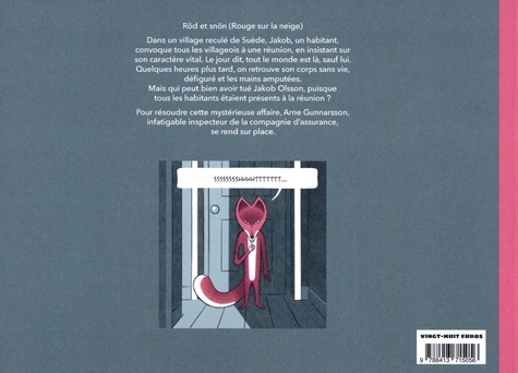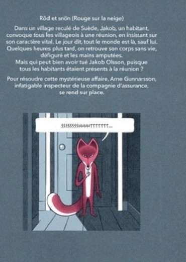 Röd et snön (Rouge sur la neige) Dans un village reculé de Suède, Jakob, un habitant, convoque tous les villageois à une réunion, en insistant sur son caractère vital. Le jour dit, tout le monde est là, sauf lui. Quelques heures plus tard, on retrouve son corps sans vie, défiguré et les mains amputées. Mais qui peut bien avoir tué Jakob Olsson, puisque tous les habitants étaient présents à la réunion ? Pour résoudre cette mystérieuse affaire, Arne Gunnarsson, infatigable inspecteur de la compagnie d'assurance, se rend sur place.