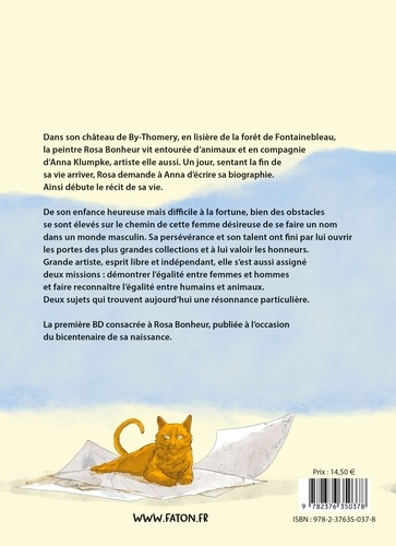 A l'occasion du bicentenaire de la naissance de Rosa Bonheur Dans son château de By-Thomery, en lisière de la forêt de Fontainebleau, la peintre Rosa Bonheur vit entourée d'animaux et en compagnie d'une amie chère, Anna Klumpke. Un jour, sentant la fin de sa vie arriver, l'artiste demande à Anna d'écrire sa biographie. Ainsi débute le récit de sa vie. De son enfance heureuse mais difficile auprès de sa mère à la fortune, bien des obstacles se sont élevés sur le chemin de cette femme désireuse de se faire un nom dans un monde masculin. Sa persévérance et son talent ont fini par lui ouvrir les portes des plus grandes collections et à lui valoir les honneurs. Grande artiste, esprit libre et indépendant, elle s'est aussi assigné deux missions : démontrer l'égalité entre femmes et hommes et faire reconnaître l'égalité entre humains et animaux. Deux sujets qui trouvent aujourd'hui une résonnance particulière. Rosa Bonheur, peintre et amie des animaux est parue en avant-première dans le magazine jeunesse Le Petit Léonard, qui initie les enfants à l'art depuis plus de vingt ans en leur racontant la vie des grands artistes et en leur présentant de façon ludique de grandes pages de l'histoire de l'art.