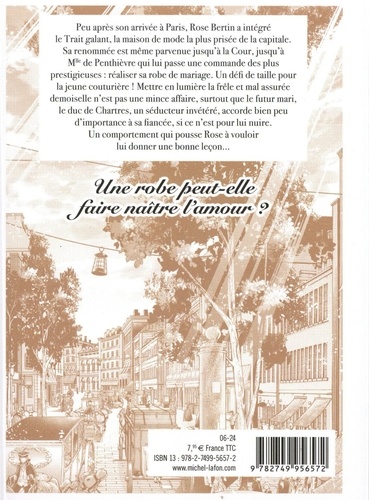 Peu après son arrivée à Paris, Rose Benin a intégré le Trait galant, la maison de mode la plus prisée de la capitale. Sa renommée est même parvenue jusqu'à la Cour, jusqu'à Mue de Penthièvre qui lui passe une commande des plus prestigieuses : réaliser sa robe de mariage. Un défi de taille pour la jeune couturière ! Mettre en lumière la frêle et mal assurée demoiselle n'est pas une mince affaire, surtout que le futur mari, le duc de Chartres, un séducteur invétéré, accorde bien peu d'importance à sa fiancée, si ce n'est pour lui nuire. Un comportement qui pousse Rose à vouloir lui donner une bonne leçon... Une robe peut-elle faire naître l'amour ?