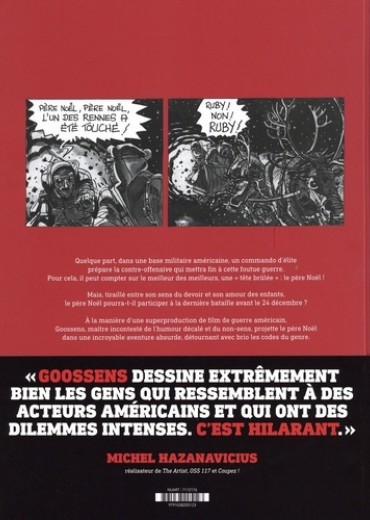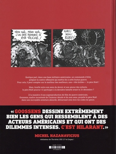 Quelque part, dans une base militaire américaine, un commando d'élite prépare la contre-offensive qui mettra fin à cette foutue guerre. Pour cela, il peut compter sur le meilleur des meilleurs, une " tête brûlée " : le père Noël ! Mais, tiraillé entre son sens du devoir et son amour des enfants, le père Noël pourra-t-il participer à la dernière bataille avant le 24 décembre ? A la manière d'une superproduction de film de guerre américain, Goossens, maître incontesté de l'humour décalé et du non-sens, projette le père Noël dans une incroyable aventure absurde, détournant avec brio les codes du genre.