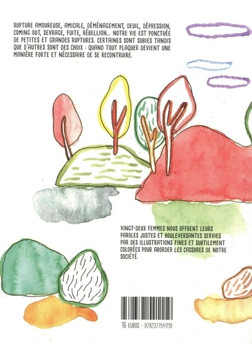Avec Ruptures, on pense d'abord à la rupture amoureuse. Ses personnages féminins s'adressent directement à nous pour dévoiler leur intimité et leurs blessures. Puis progressivement, subtilement, Ruptures élargit sa définition et nous dévoile d'autres cassures : l'amitié qui s'arrête, perdre un proche, changer de lieu de vie, dire adieu à une partie de soi, arrêter une habitude, quitter un pays, quitter la ville, la politique, abandonner le "monde d'avant"⦠Rompre devient alors une façon forte et nécessaire de se (re)construire. Des textes justes et bouleversants dans un écrin d'illustrations fines et colorées pour parler des petites et des grandes ruptures de notre société.