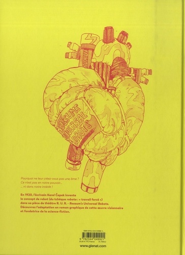 L'ère des robots est déjà là ! Isolée sur une île, l'usine R. U. R. s'est lancée dans la production d'êtres humains artificiels. Semblables à des androïdes, ces " robots " performants et dénués de tout sentiment sont censés libérer enfin l'Homme du travail ! Un rêve pour le directeur, une abomination pour Helena qui découvre ces créatures avec effroi en visitant les chaînes de production. Troublée par leur aspect humanoïde, cette jeune femme a un mauvais pressentiment. Les robots sont-ils aussi insensibles qu'on le pense ? Méconnaissant l'amour, ignorant la mort, la fatigue ou l'ennui, ils finissent cependant par ressentir la douleur après une nouvelle programmation ! Imperturbables, ils continuent néanmoins d'obéir aveuglément... Les années passent et les inquiétudes d'Helena persistent alors que la Société s'est désormais habituée aux robots. Devenus indispensables, leur nombre augmente. Mais vont-ils rester impassibles longtemps ? Ressentent-ils des émotions, des passions, de la haine ? Tandis qu'une rébellion des robots aussi inattendue que brutale s'annonce, leurs créateurs se retrouvent pris au piège dans leur propre usine. L'Humanité vit-elle ses dernières heures face à une nouvelle ère des robots ? Katerina Cupová, jeune prodige de la bande dessinée tchèque, nous propose une adaptation somptueuse de R. U. R. , oeuvre fondatrice dans laquelle le mot " robot " est apparu pour la première fois en 1920 ! Pièce de théâtre de l'écrivain Karel Capek qui compta Antonin Artaud parmi ses premiers interprètes, cette dystopie sociale aborde un thème largement repris depuis, mais auquel le roman graphique, captivant et moderne, redonne un coup d'éclat. Offrant une réflexion sur les notions de travail, de progrès, l'ouvrage nous questionne ainsi sur notre propre humanité. Le style graphique de l'autrice, élégant et coloré, annonce définitivement l'émergence d'un nouveau talent.
