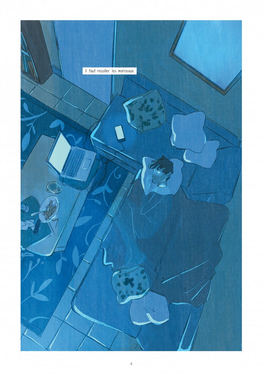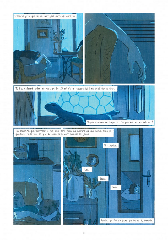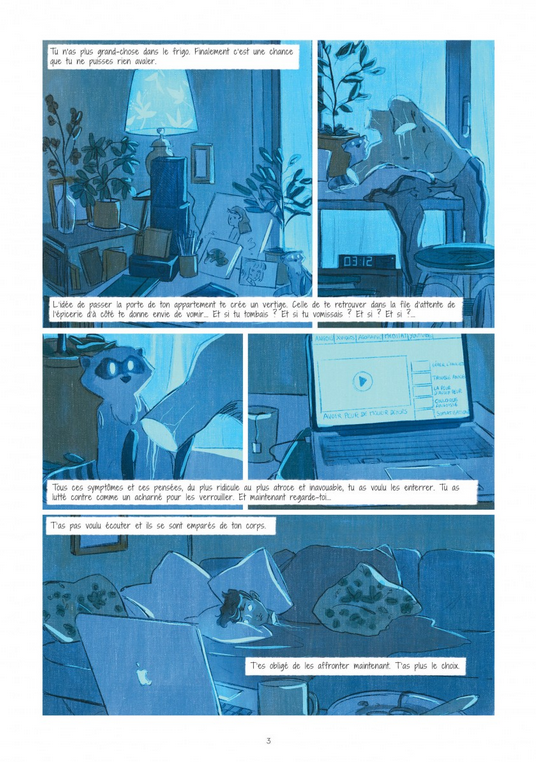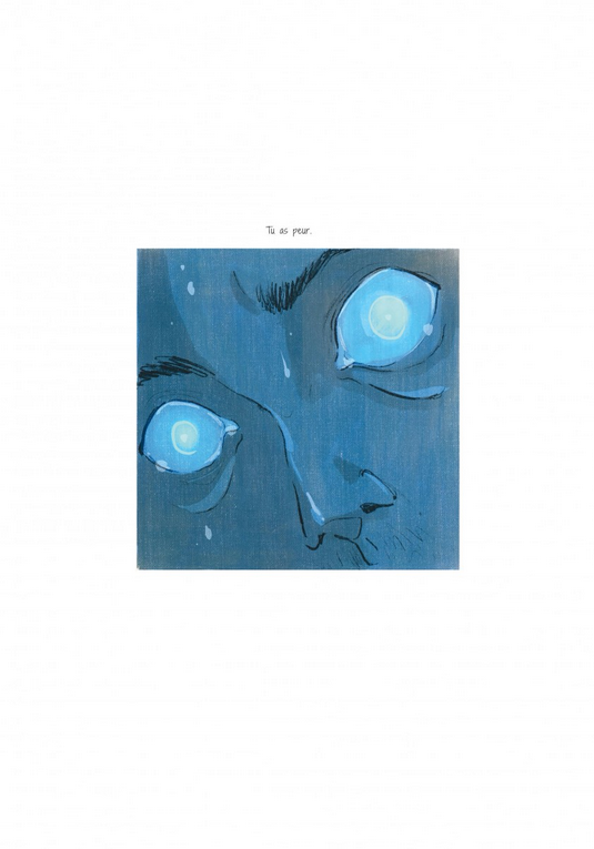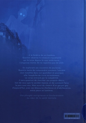 A la fenêtre de sa chambre, Quentin observe la créature bleue et inquiétante qui le toise depuis la cour extérieure... L'angoisse monte. Et ne repartira pas de sitôt. En explorant ses souvenirs de jeunesse, Quentin tente de comprendre comment l'anxiété s'est installée dans son quotidien et pourquoi elle l'empêche de vivre normalement. Du corps entravé à la culpabilité, il sera question de chercher ses propres désirs, loin de ceux que la société impose, et de comment faire la paix avec eux. Mais aussi du chemin d'un garçon gay d'aujourd'hui, avec ses blessures d'enfance et d'adolescence, entre peurs et lumières. Une plongée vertigineuse et bouleversante au coeur de la santé mentale.