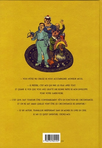 - Vous n'étiez pas obligé de nous accompagner, monsieur Micol. - Je préfère, c'est moi qui paye les frais après tout. Et quand je vois que vous avez gratté une bonne partie de mon enveloppe pour votre garde-robe. - C'est qu'il faut toujours être convenablement vêtu en fonction des circonstances, et on ne sait jamais quelles vont être les circonstances de l'aventure ! - Je suis auteur, travailleur indépendant dans un monde du livre en crise. Je sais ce qu'est l'aventure, croyez-moi.