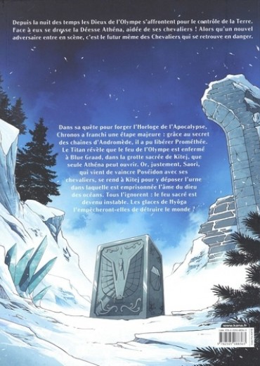Dans sa quête pour forger l'Horloge de l'Apocalypse, Chronos a franchi une étape majeure : grâce au secret des chaînes d'Andromède, il a pu libérer Prométhée. Le Titan révèle que le feu de l'Olympe est enfermé à Blue Graad, dans la grotte sacrée de Kitej, que seule Athéna peut ouvrir. Or, justement, Saori, qui vient de vaincre Poséidon avec ses chevaliers, se rend à Kitej pour y déposer l'urne dans laquelle est emprisonnée l'âme du dieu des océans. Tous l'ignorent : le feu sacré est devenu instable. Les glaces de Hyôga l'empêcheront-elles de détruire le monde ?