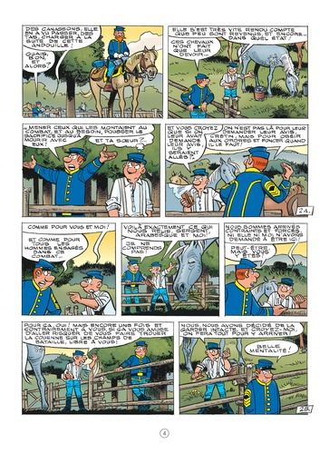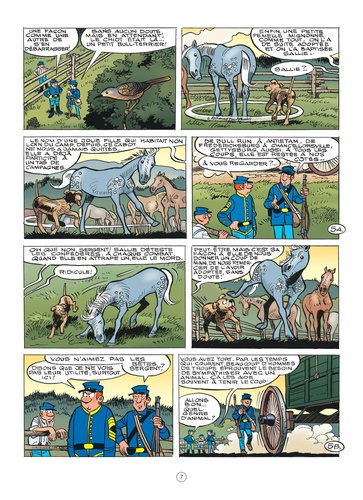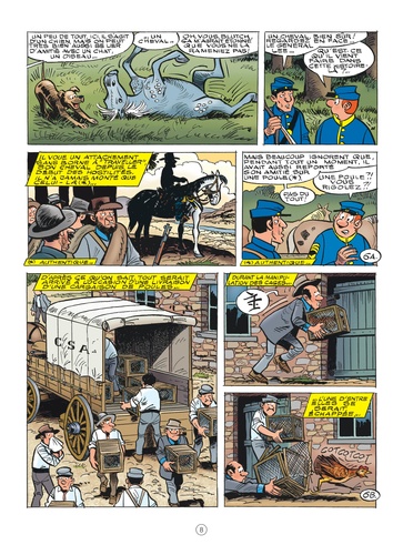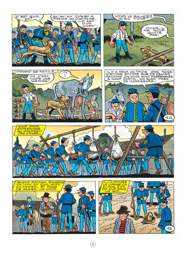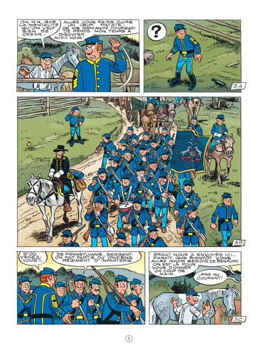 La jument Arabesque, Traveller, l'étalon du général Lee et même Nellie, sa poule... Les bêtes ont la part belle dans cette soixante-deuxième aventure des Tuniques Bleues ! Qu'ils soient sur le champ de bataille ou qu'ils accompagnent les soldats dans leur vie quotidienne, les animaux ont en effet eu une importance parfois déterminante lors des conflits, et Cauvin et Lambil nous en offrent un aperçu dans cette nouvelle aventure du caporal Blutch et du ser-gent Chesterfield. La chienne Sallie, héroïne de ce récit, en est d'ailleurs l'exemple criant. Alors que des renforts du onzième régiment d'infanterie sont dépêchés depuis la Pennsylva-nie pour prêter main-forte au camp de nos deux héros, face à la menace d'un affrontement imminent, les commandants confient à Chesterfield une mission aussi risquée que capitale : la capture d'un ennemi afin de lui soutirer des informations. Une opération que Sallie décide de suivre en accompagnant le sergent, car du résultat de cette mission découle surtout la vie de plusieurs milliers de soldats...