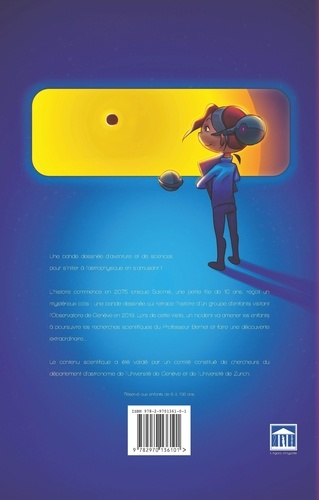 Une bande dessinée d'aventure et de sciences pour s'initier à l'astrophysique en s'amusant ! L'histoire commence en 2075 lorsque Salomé, une petite fille de 10 ans reçoit un mystérieux colis... une bande dessinée qui retrace l'histoire d'un groupe d'enfants visitant l'Observatoire de Genève en 2019. Lors de cette visite, un incident va amener les enfants à poursuivre les recherches scientifiques du Professeur Bernet et faire une découverte extraordinaire... Ecrit par un astrophysicien de l'Observatoire de Genève. Avec la participation de Michel Mayor, Prix Nobel de Physique 2019.