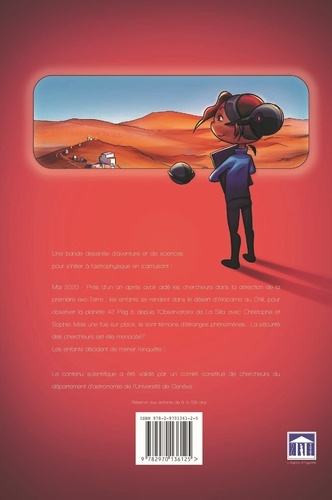 Une bande dessinée d'aventure et de sciences pour s'initier à l'astrophysique en s'amusant ! Mai 2020- Près d'un an après avoir aidé les chercheurs dans la détection de la première exo-Terre ; les enfants se rendent dans le désert d'Atacama au Chili, pour observer la planète 42 Peg b depuis l'Observatoire de la Silla avec Christophe et Sophie. Mais une fois sur place, ils sont témoins d'étranges phénomènes... La sécurité des chercheurs est-elle menacée ? Les enfants décident de mener l'enquête ! Ecrit par un astrophysicien de l'Observatoire de Genève. Avec la participation de Michel Mayor et Didier Quéloz, Prix Nobel de Physique 2019.