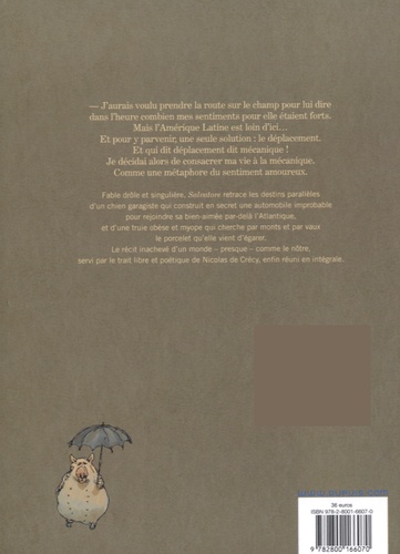 J'aurais voulu prendre la route sur le champ pour lui dire dans l'heure combien mes sentiments pour elle étaient forts. Mais l'Amérique Latine est loin d'ici... Et pour y parvenir, une seule solution : le déplacement. Et qui dit déplacement dit mécanique ! Je décidai alors de consacrer ma vie à la mécanique. Comme une métaphore du sentiment amoureux. Fable drôle et singulière, Salvatore retrace les destins parallèles d'un chien garagiste qui construit en secret une automobile improbable pour rejoindre sa bien-aimée par-delà l'Atlantique, et d'une truie obèse et myope qui cherche par monts et par vaux le porcelet qu'elle vient d'égarer. Le récit inachevé d'un monde – presque – comme le nôtre, servi par le trait libre et poétique de Nicolas de Crécy, enfin réuni en intégrale.