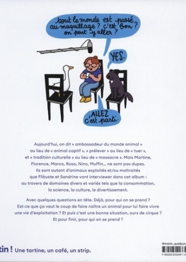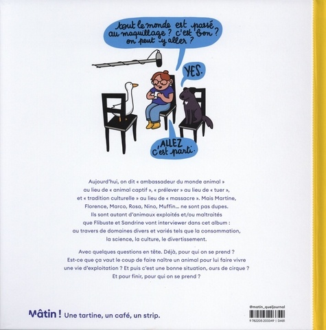 Aujourd'hui, on dit "ambassadeur du monde animal" au lieu de "animal captif", "prélever" au lieu de "tuer", et "tradition culturelle" au lieu de "massacre". Mais Martine, Florence, Marco, Rosa, Nino, Muffin... ne sont pas dupes. Ils sont autant d'animaux exploités et/ou maltraités que Flibuste et Sandrine vont interviewer dans cet album : au travers de domaines divers et variés tels que la consommation, la science, la culture, le divertissement. Avec quelques questions en tête. Déjà, pour qui on se prend ? Est-ce que ça vaut le coup de faire naître un animal pour lui faire vivre une vie d'exploitation ? Et puis c'est une bonne situation, ours de cirque ? Et pour finir, pour qui on se prend ?