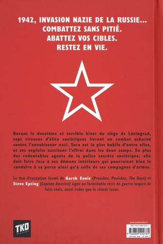 Nous sommes en Russie pendant l'interminable hiver 1942, et nous suivons le sniper soviétique Sara, tandis qu'elle résiste aux envahisseurs nazis avec ses camarades. Les femmes du campement sont isolées dans un baraquement à part et l'unité repousse vaillamment l'ennemi, mais pour combien de temps ? Une histoire complète inspirée d'une histoire vraie. Garth Ennis (The Boys, Preacher, Punisher) n'est jamais autant à l'aise que sur les histoires de guerre. Il est donc ici dans son élément aux côtés de l'efficace Steve Epting, qui illustrait entre autres le Captain America d'Ed Brubaker. Des dessins qui valaient bien un format un peu plus grand que le format comics habituel.