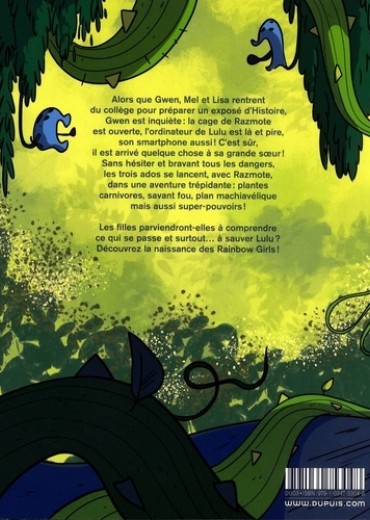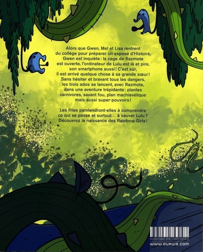 A la sortie du collège, Gwen, Lisa et Mel se retrouvent. Elles ont un exposé d'histoire à préparer, mais quand elles arrivent chez Gwen, sa grande soeur Lulu a disparu ! La cage de Razmote, le rat domestique, est ouverte et il a l'air terrifié. La jeune étudiante a laissé son ordinateur et surtout son smartphone dont elle ne se sépare jamais. C'est sûr, il lui est arrivé quelque chose ! Il faut mener l'enquête. Bravant le danger, les trois ados se lancent avec Razmote dans une aventure trépidante qui les conduira à Lulu mais aussi à une serre de plantes carnivores et un savant fou, bien décidé à finaliser un terrible dessein... à l'origine de leurs super-pouvoirs. Découvrez comment les Rainbow Girls sont nées !