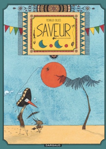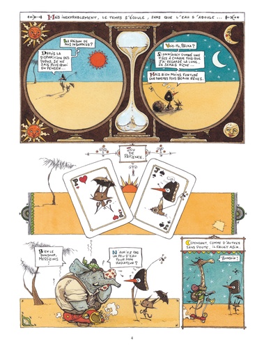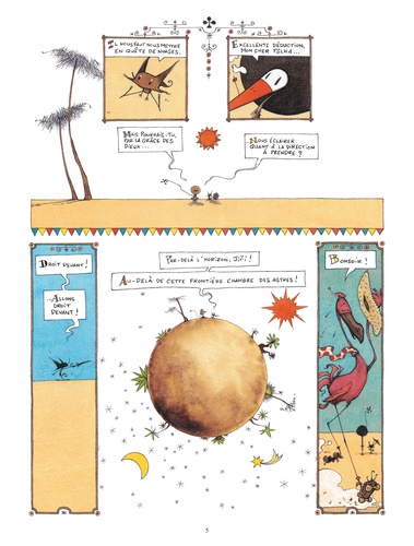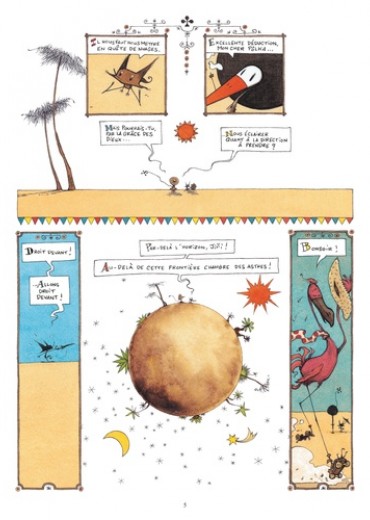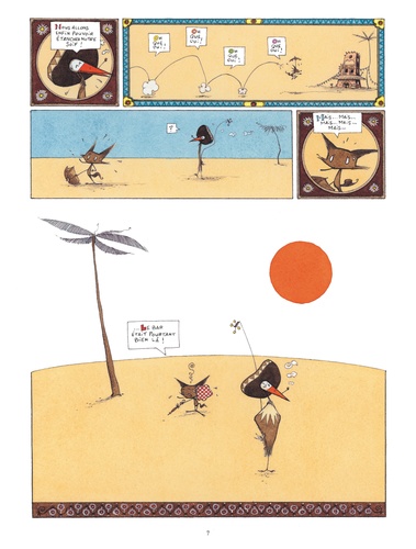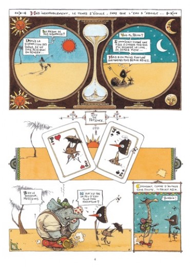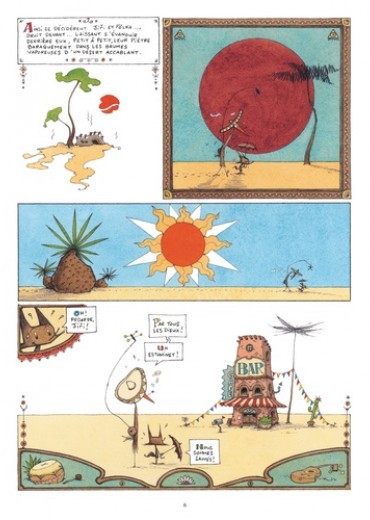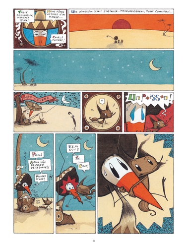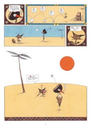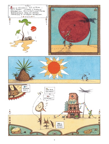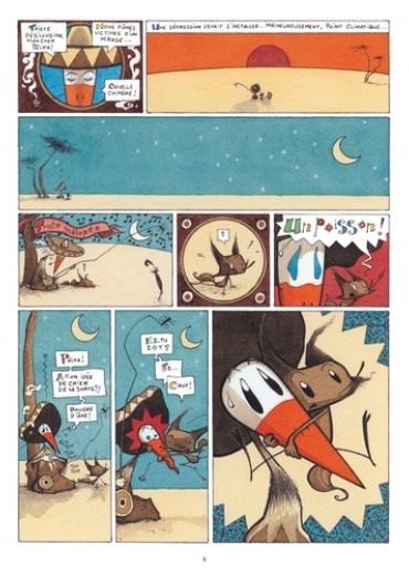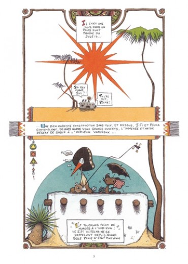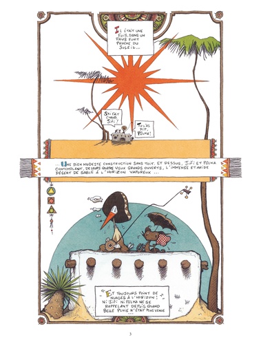 Jiri et Pôlka ont soif, très soif dans le désert et ils cherchent de l’eau. Jusque-là, tout va bien. Sauf qu’il s’agit d’une cigogne et d’une espèce de renard, que ceux-ci gardent précieusement une noix de coco en espérant dénicher un marteau, qu’ils poursuivent un énorme poisson qui vagabonde dans le ciel et disparaît au lever du soleil… Et tout cela sous forme d’enluminures mexicaines, avec des dialogues particulièrement savoureux. Un petit bijou d’absurdité !