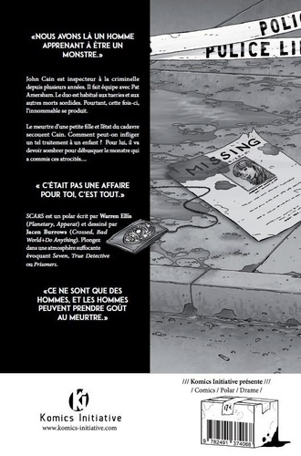 John Cain est inspecteur à la criminelle depuis plusieurs années. Il fait équipe avec Pat Amersham. Le duo est habitué aux tueries et aux autres morts sordides. Pourtant, cette fois-ci, l'innommable se produit. , Le meurtre d'une petite fille et l'état du cadavre secouent Cain. Comment peut-on infliger un tel traitement à un enfant ? Pour lui, il va devoir sombrer pour débusquer le monstre qui a commis ces atrocités.... Scars est un polar écrit par Warren Ellis (Planetary, Apparat) et dessiné par Jacen Burrows (Crossed, Bad World+Do Anything). Plongez dans une atmosphère suffocante évoquant Seven, True Detective ou Prisoners.