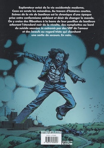 Explorateur avisé de la vie occidentale moderne, Caza en scrute les méandres. Au travers d'histoires courtes, Scènes de la vie de banlieue est la chronique d'une époque prise entre conformisme ambiant et désir de changer le monde. On y croise des flibustiers à la barre de leur pavillon de banlieue arborant l'étendard noir de la révolte, des âmes esseulées piégées à l'intérieur de cités pavillonnaires, et une panoplie de voisins qui cherchent toujours une issue de secours. La dextérité de Caza et son ton corrosif en font une oeuvre majeure des années 1990, à découvrir ou redécouvrir !