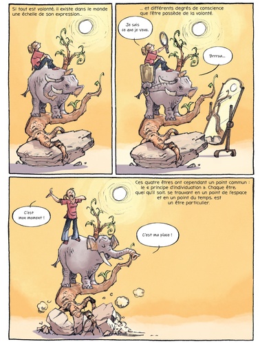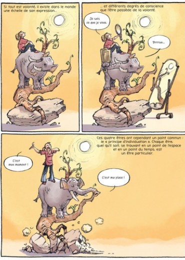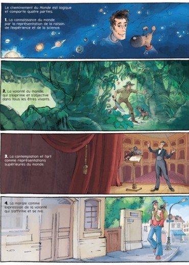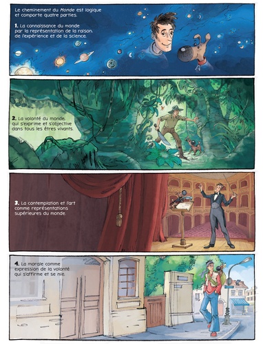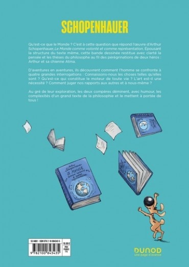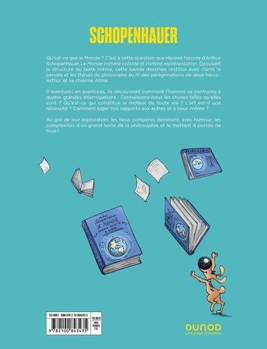 Qu'est-ce que le Monde ? Pour répondre à cette question, suivons Arthur et sa chienne Atma, les deux personnages de cette bande dessinnée et explorons l'oeuvre majeure de Schopenhauer : Le Monde comme Volonté et comme Représentation. Pour le philosophe, le monde est ce que l'on en voit et l'idée que l'on s'en fait. Ainsi nous ne connaissons pas le monde tel qu'il est mais tel que nous le voyons. La représentation du Monde est le premier axe de sa réflexion. Le second est la volonté. Tout dans le monde vivant (humains, animaux, végétaux voire minéraux) est mû par la volonté (c'est-à-dire le vouloir-vivre). Epousant la strucure du texte de Schopenhauer la BD restitue avec clareté la pensée et les thèses du philosophe : 4 parties de l'oeuvre originale = 4 univers graphiques identifiés = 4 temps forts de la pensée de Schopenhauer expliqués. Non sans humour, Arthur et Atma déminent les complexités d'un grand texte de la philosophie et le mettent à portée de tous.