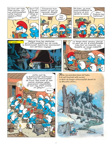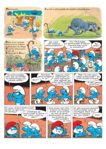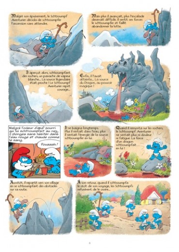 Dans un grenier, les Schtroumpfs retrouvent un très vieux livre qui raconte les aventures d'un Schtroumpf aventurier qui se rend au lointain Mont du Dragon. Après s'être baigné dans l'eau rouge d'une source, il devient une sorte de Surschtroumpf, insensible à la peur, à la fatigue et à la douleur. Trois Schtroumpfs, fatigués des moqueries dont ils sont victimes, décident de se rendre à la source pour devenir eux aussi des héros !