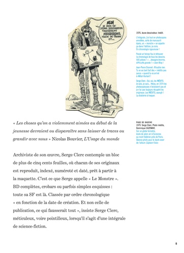 Dans les années 70, Serge Clerc fait une entrée fracassante dans la bande dessinée de science-fiction, jusqu'alors balbutiante. Dessinateur pour le magazine spécialisé "Métal Hurlant", à la fois disciple et dynamiteur du genre, il signera illustrations, couvertures, histoires courtes et parodies à profusion, jusqu'à créer deux albums complets : "Captain Futur" avec Philippe Manoeuvre au scénario et "Sam Bronx et les robots", l'une de ses oeuvres majeures. Artiste prolixe, celui que l'on surnommera le "dessinateur espion" a entretenu durant près de dix ans une relation étroite avec la science-fiction, que cette intégrale au titre évocateur se propose de retracer pas à pas. Introduite par Stan Barets, cette troisième compilation des travaux de Serge Clerc explore les galaxies et les bulles et nous offre un aller simple au-delà des étoiles, sans qu'il se départe jamais d'un humour tout martien. Ses dessins, exhaustifs et classés par ordre chronologique de création, sont un formidable retour vers le futur, à une époque qui ose tout. Une rêve-party aux confins du cosmos !